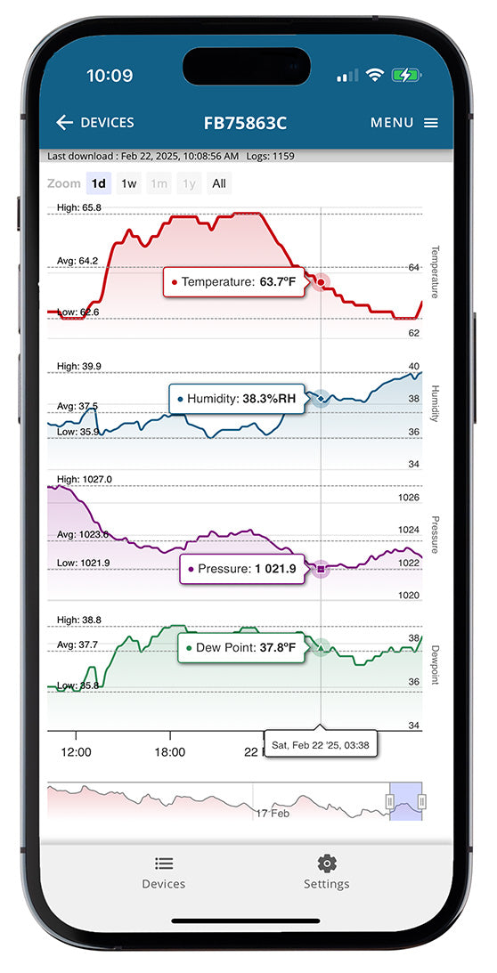 ✔ Continuous logging, storing up to 100,000 entries in the device even when out of range, with unlimited storage in the app